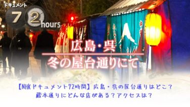 2026年2月27日(金)放送のNHKドキュメント72時間は広島・呉の屋台通りに密着です!日本の昭和文化の象徴ともいえる屋台ですが、近年では景観配慮などで少なくなってきているように思います。屋台通りといえば、福岡/博多というイメージが強いの...