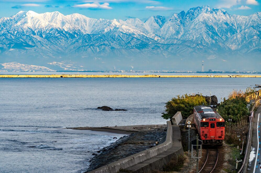 また、道の駅の前にはJR氷見線が走っており、海と電車と立山連峰が一枚の写真に収まる絶景スポットでもあるんです!